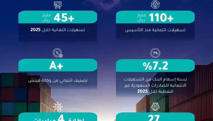 شكّل عام 2025 محطة مفصلية في مسيرة بنك التصدير والاستيراد السعودي، حيث واصل البنك دوره الاستراتيجي في تمكين نفاذ الصادرات السعودية غير النفطية إلى الأسواق العالمية، فقد وصل إجمالي التسهيلات الائتمانية التي قدمها إلى أكثر من 110 مليار ريال سعودي، وحصوله على أول تصنيف ائتماني له من وكالة فيتش بدرجة +A مع نظرة مستقبلية مستقرة، نتيجة لما يقدمه من حلول ائتمانية متكاملة، تعزز من تنافسية الصادرات غير النفطية وتسهم في تحقيق مستهدفات رؤية السعودية 2030.