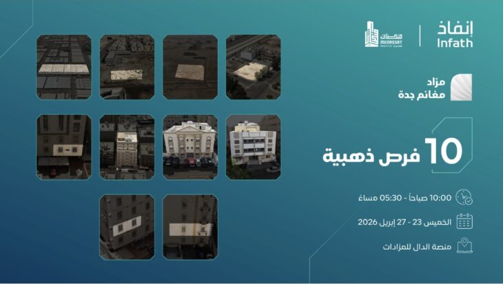 تعلن شركة منصات العقارية عن إقامة مزاد مغانم جدة الإلكتروني لطرح 10 عقارات متنوعة في مدينة جدة تحت إشراف مركز الاسناد والتصفية – إنفاذ, وبقرار من محكمة التنفيذ وبحكم من محكمة الاحوال الشخصية والذي سيُقام يوم الخميس 23 أبريل  2026 في تمام الساعة العاشرة صباحًا حتى يوم الأثنين 27 أبريل، وذلك إلكترونيًا عبر منصة الدال للمزادات